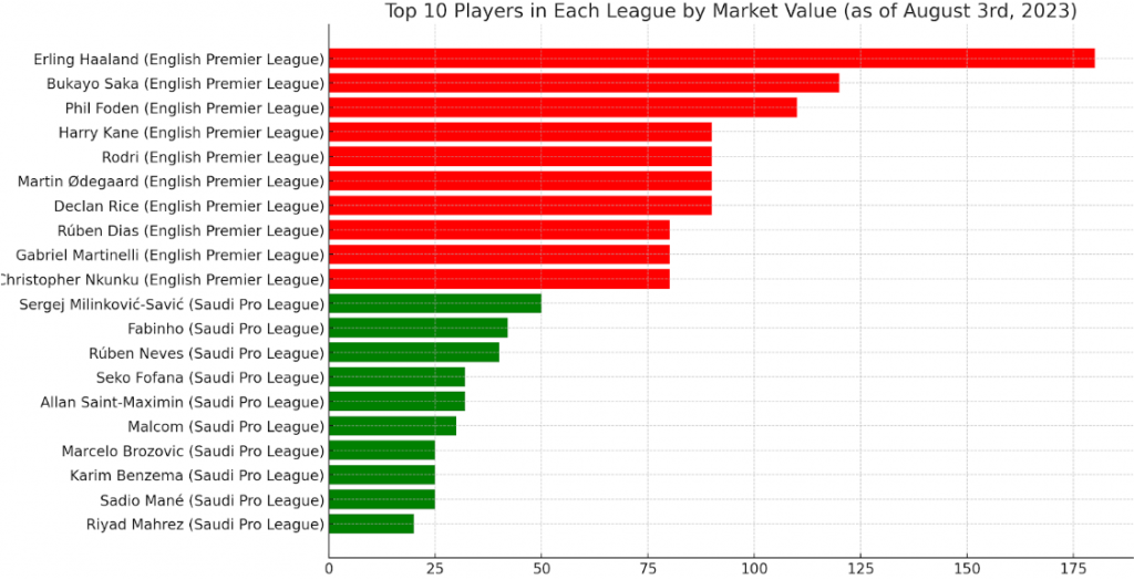 - Closing the Gap: Despite the current average market value of players in the Saudi Pro League standing at around €6.6 million, compared to the English Premier League’s €53.8 million, the gap is closing rapidly, underscoring the Saudi Pro League’s potential.